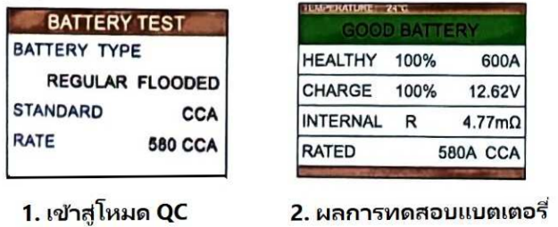 เชื่อมต่อแคลมป์ทดสอบสีแดงกับขั้วบวกแบตเตอรี่และสีดำเข้ากับขั้วลบ เครื่องทดสอบจะเปิดเครื่องโดย (หากแบตเตอรี่มีแรงดันไฟฟ้าต่ำกว่า 7.0V DC จะไม่สามารถทดสอบได้อย่างถูกต้อง) จากนั้น อัตโนมัติ ให้กดปุ่ม INTER เพื่อดำเนินการต่อ